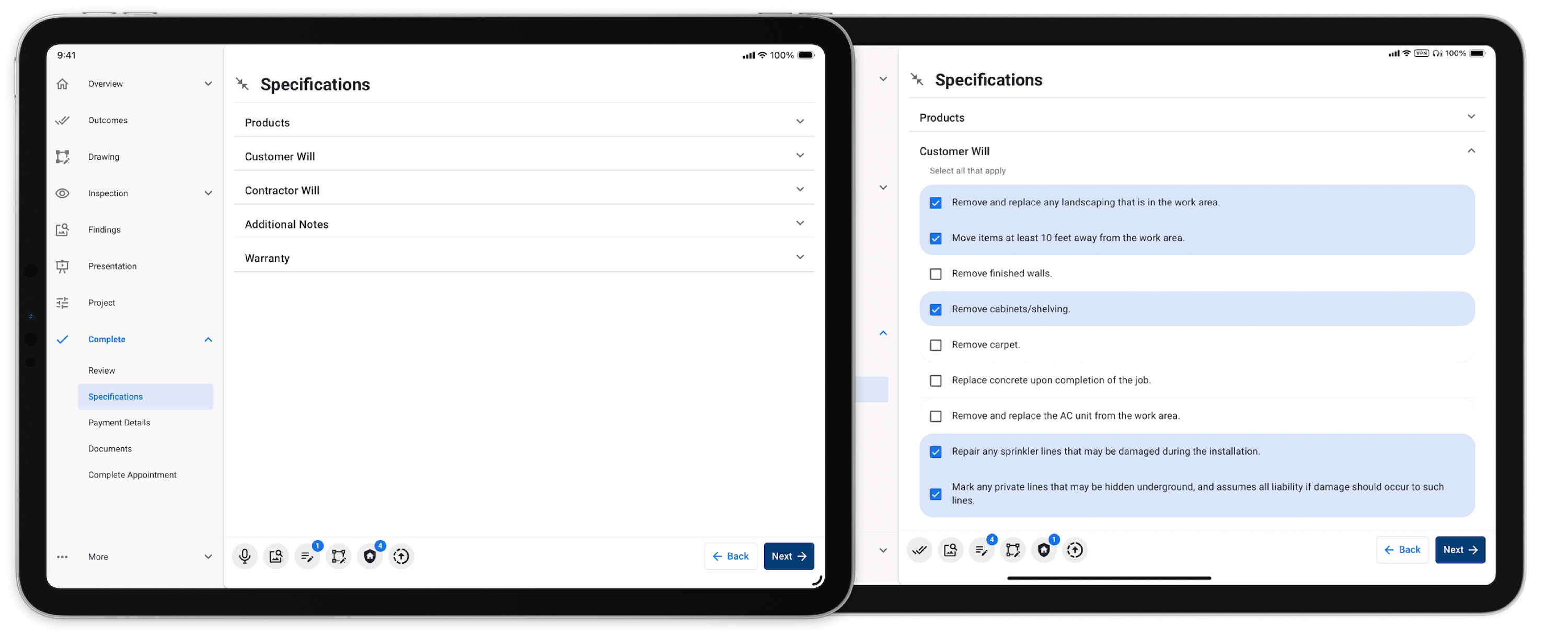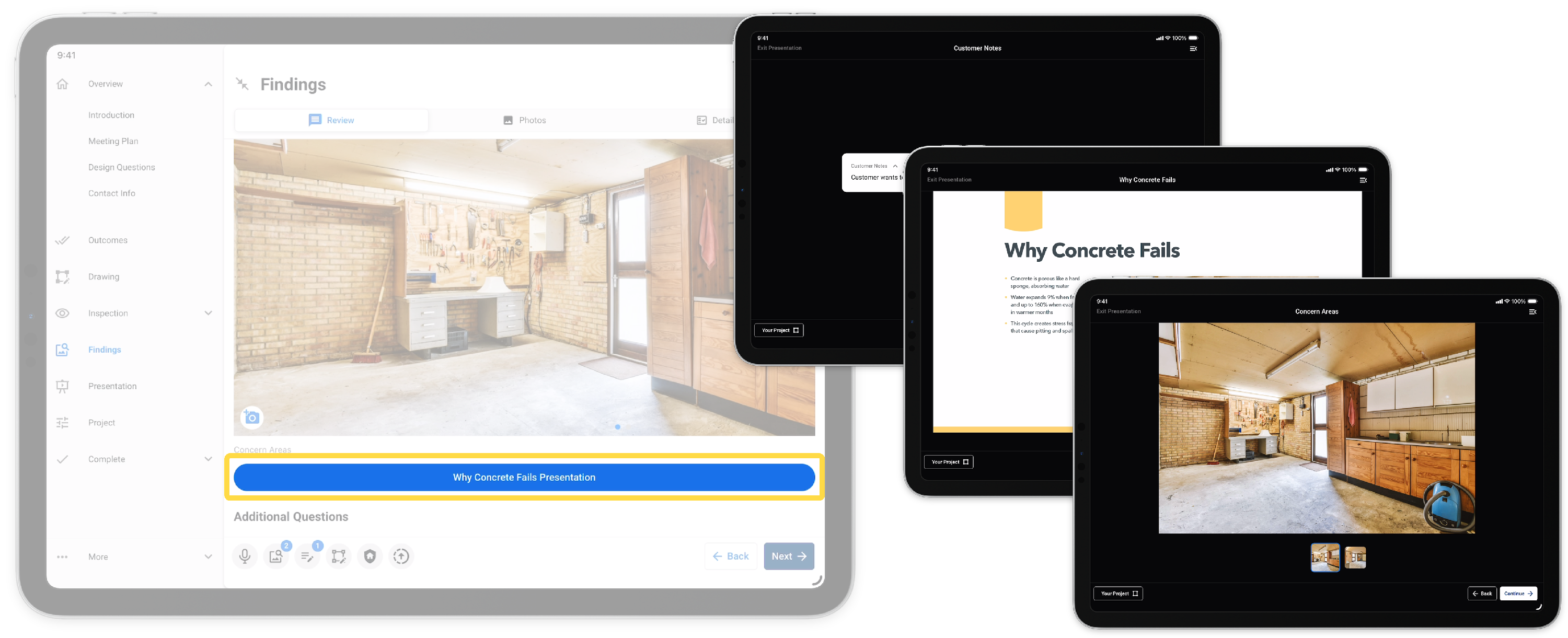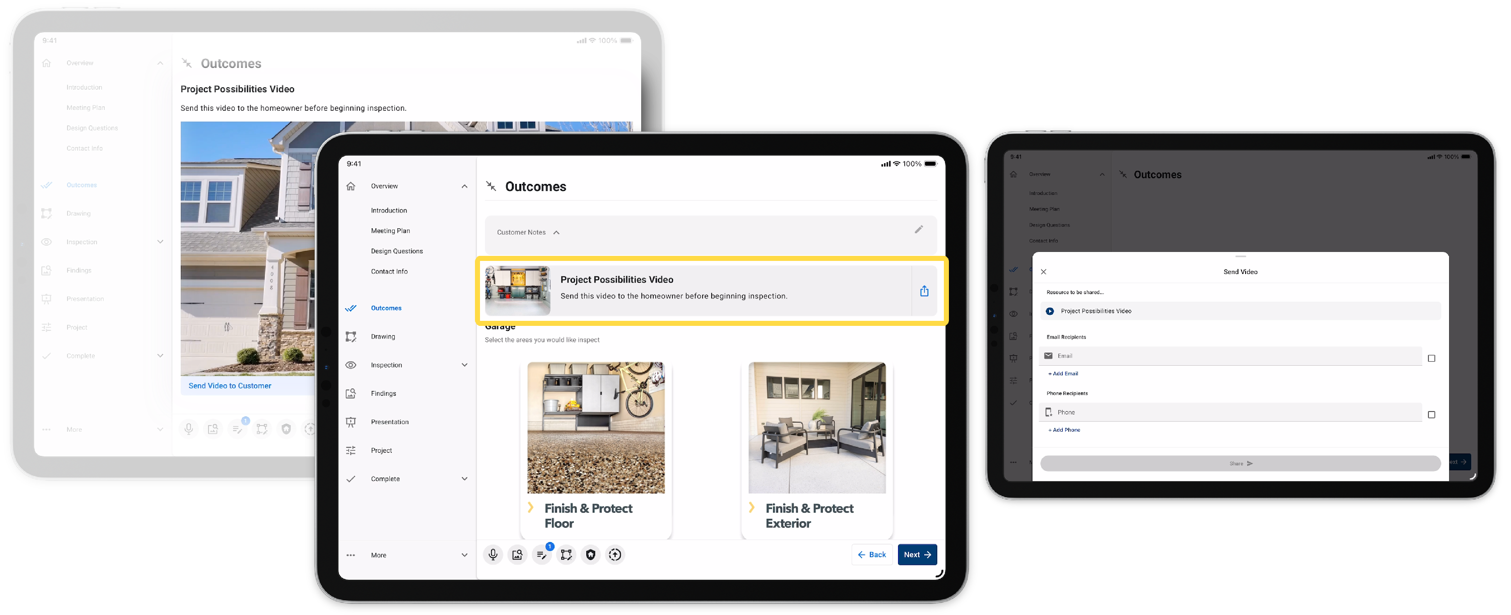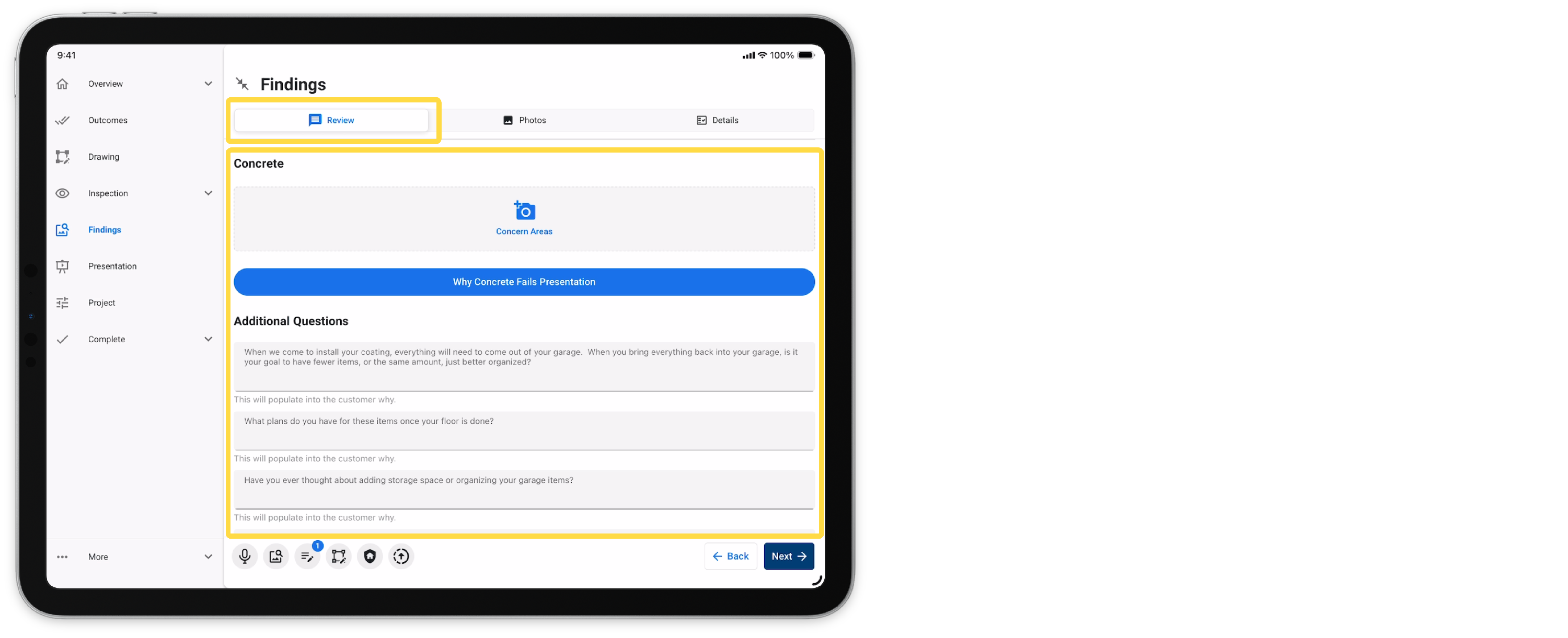 This allows recommendations to a customer that weren't discovered during the inspection. Once added, the user will be able to present, add products, and review the area project without navigating back to the inspection.