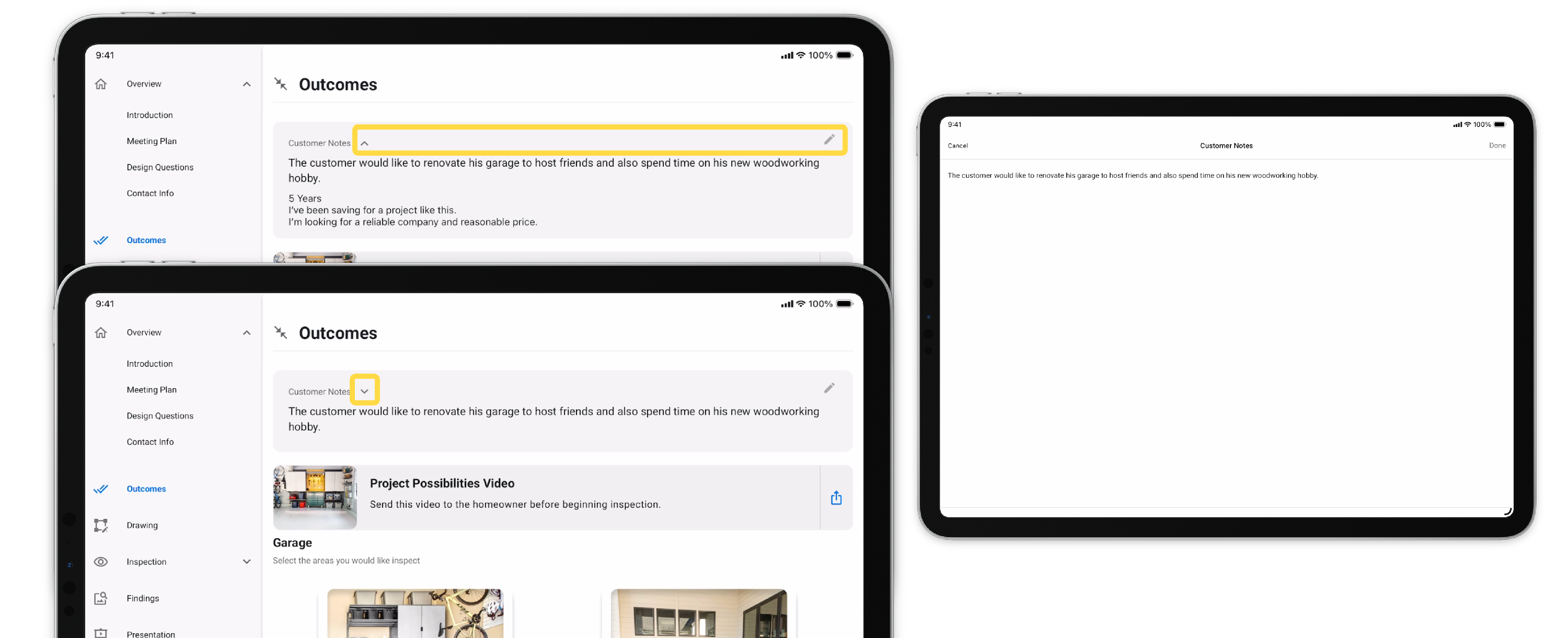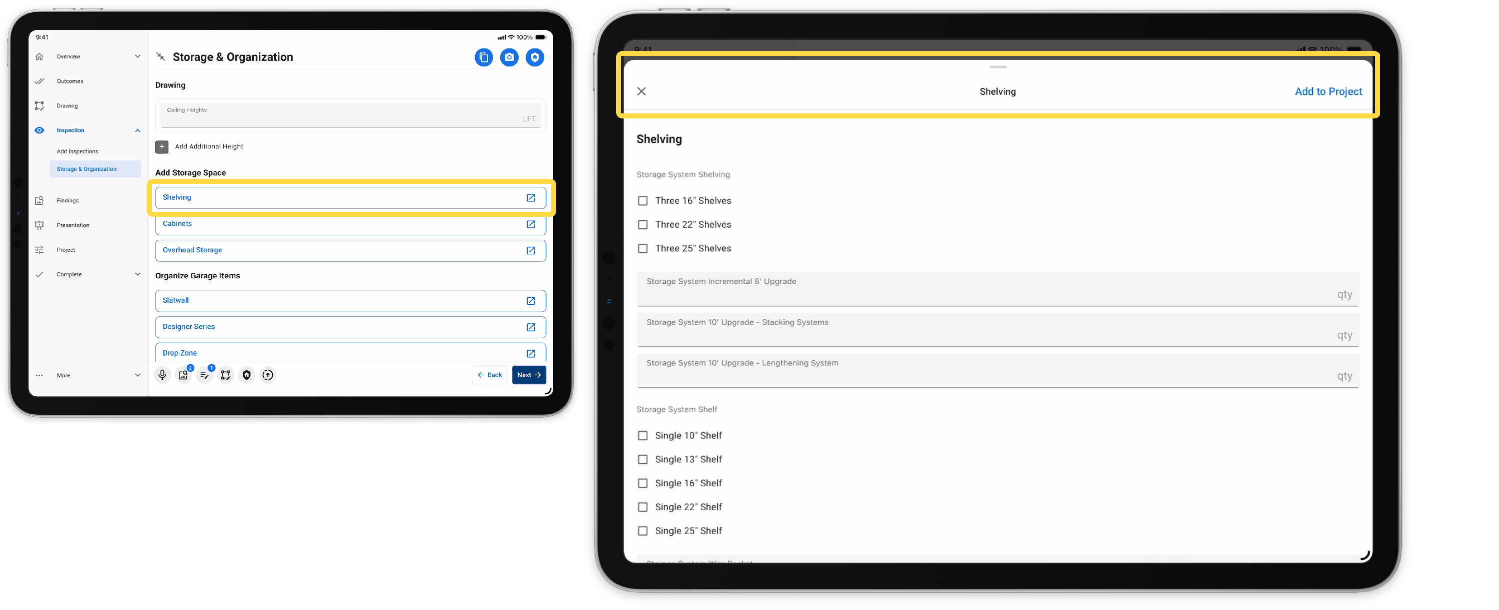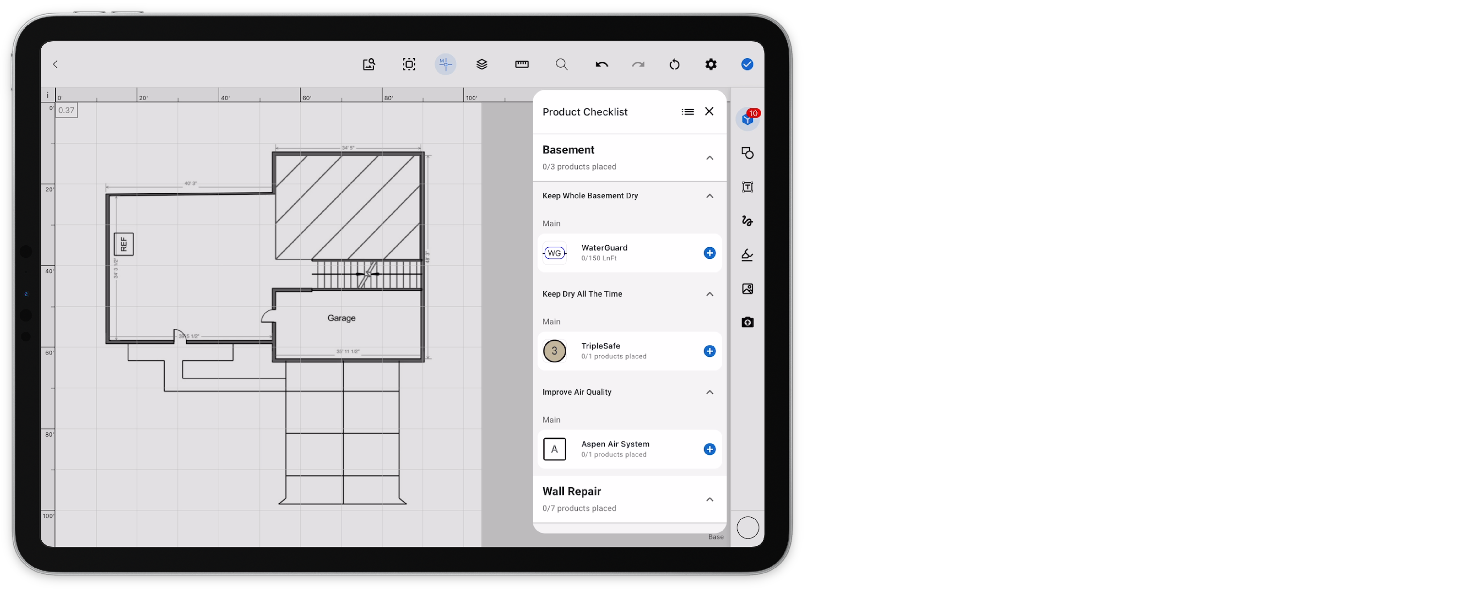 This allows recommendations to a customer that weren't discovered during the inspection. Once added, the user will be able to present, add products, and review the area project without navigating back to the inspection.
