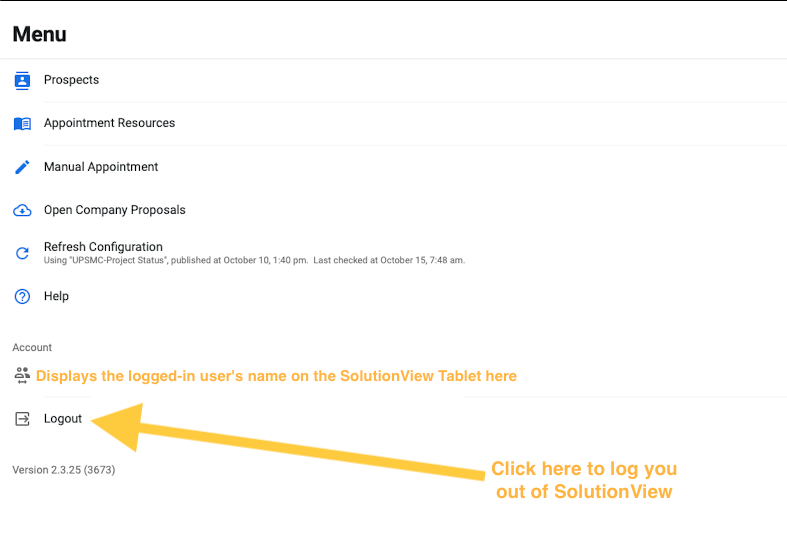 Next when on the Menu page after it opens you will be able to log out of SolutionView as seen below: